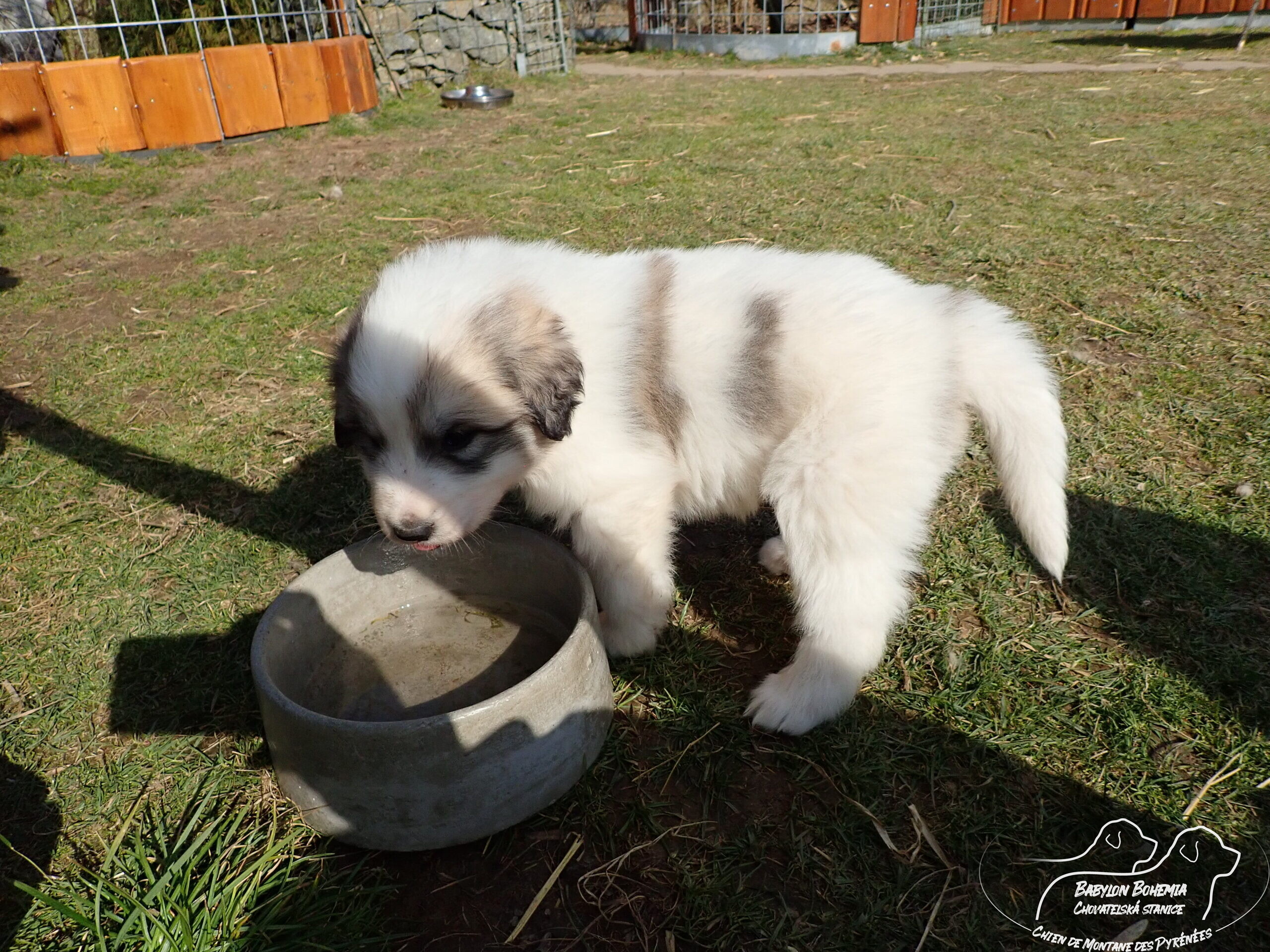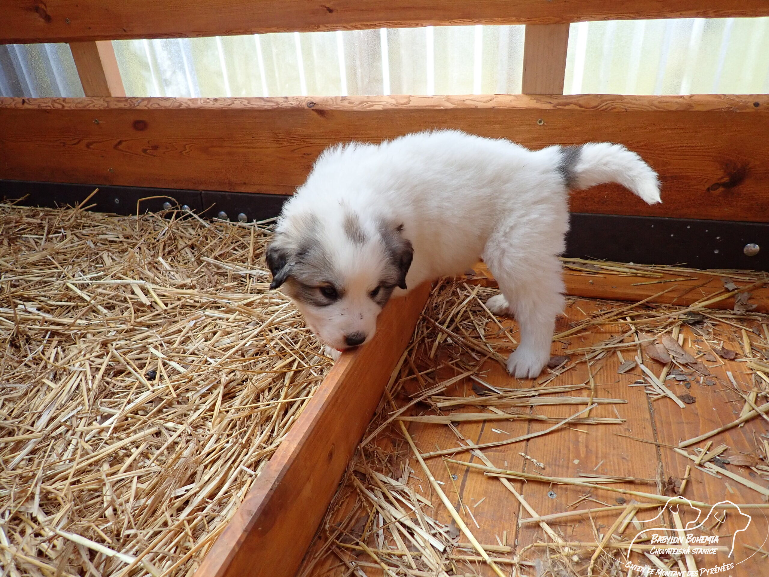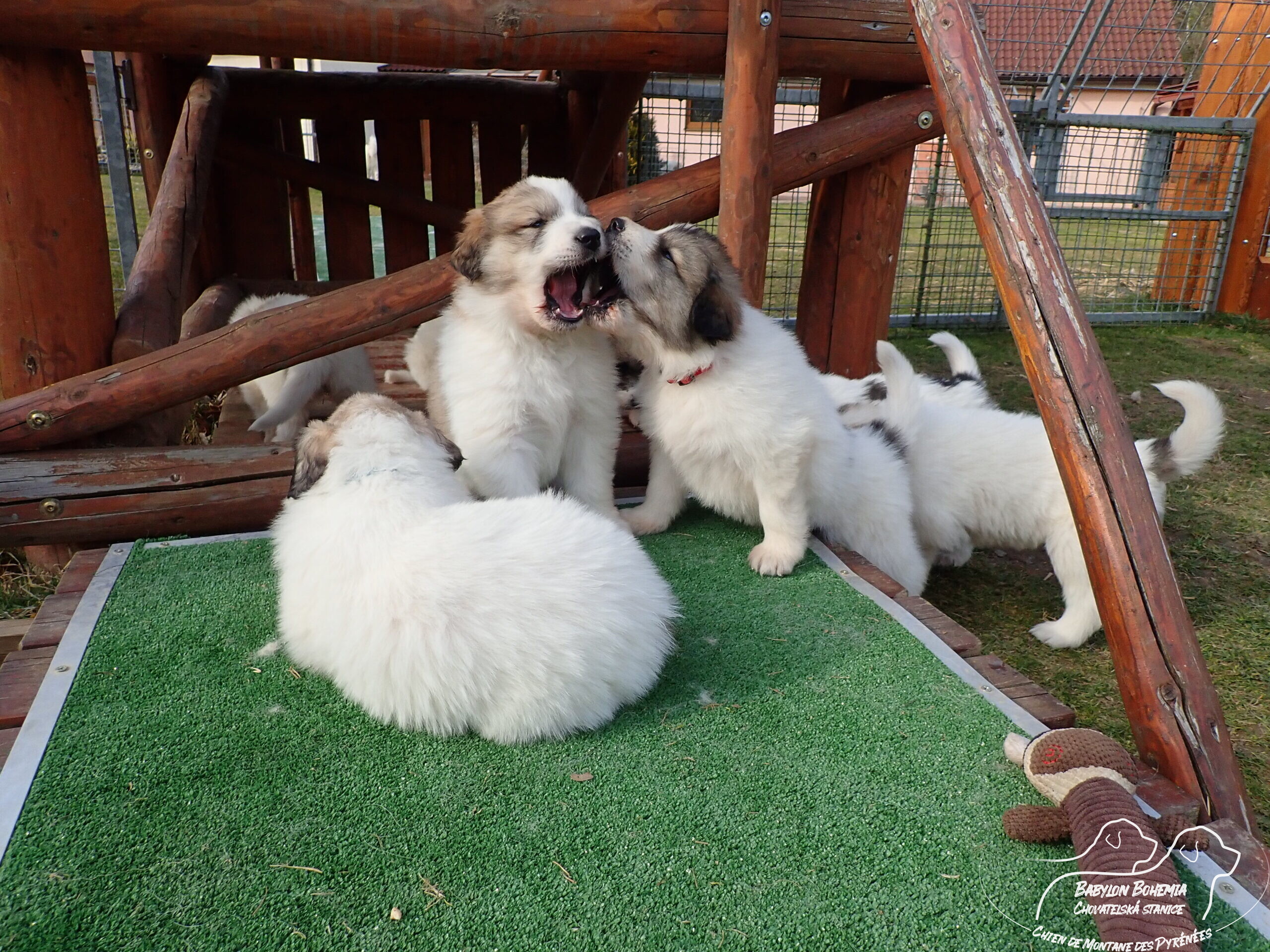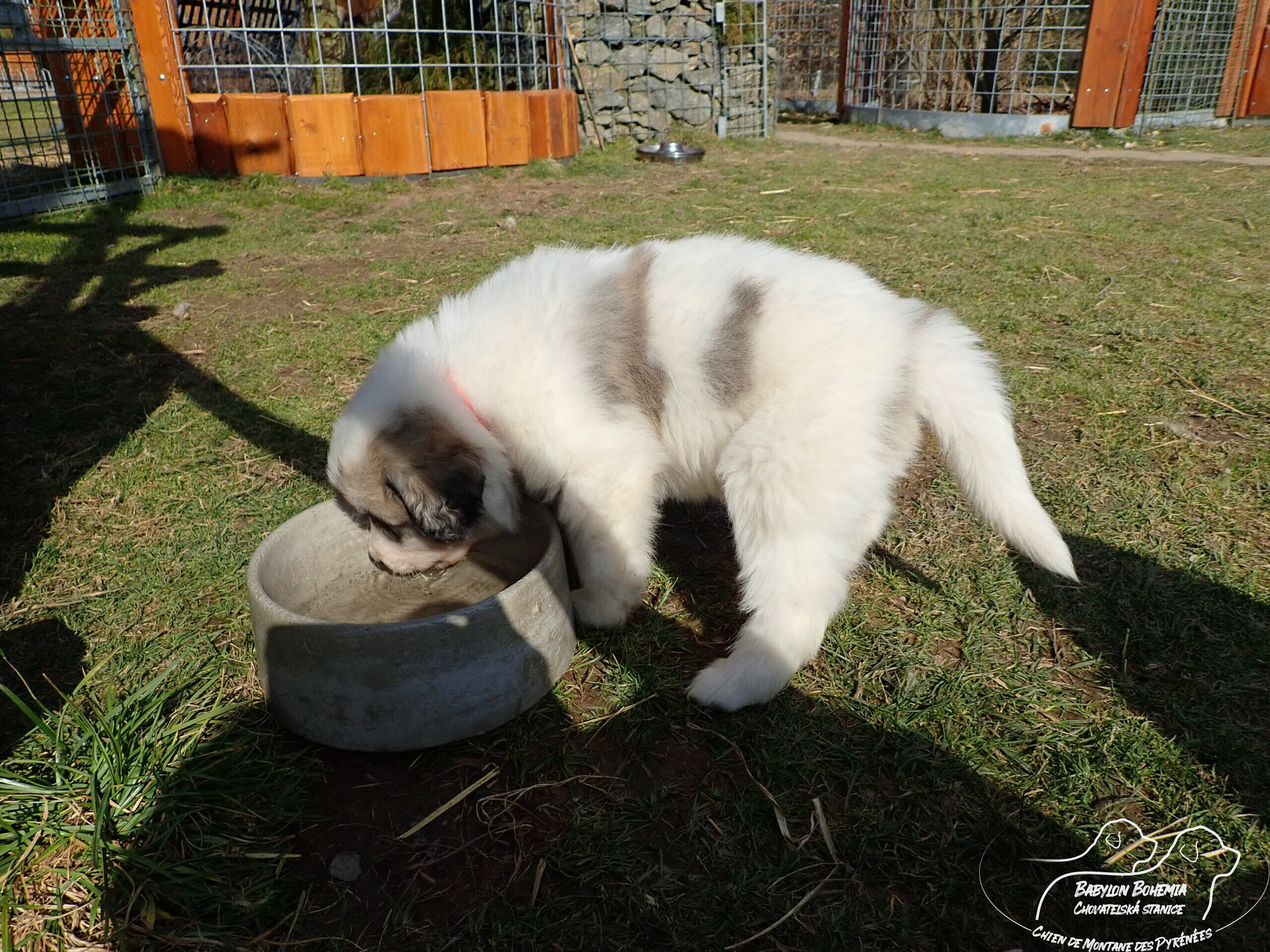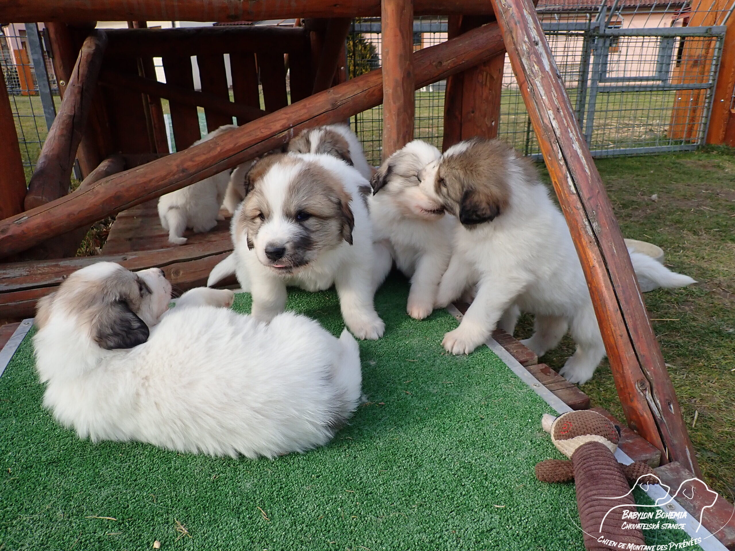 Štěňátka poznávají okolí kotce a nejbližší část zahrady. venku tráví většinu dne, užívají si sluníčka. Krmíme z misky, matka jim dává napít jen párkrát za den. Neustále je hlídá, ale zpovzdálí, aby měla od nich klid. Štěnda si hrají, perou se, vše ochutnávají a poznávají..