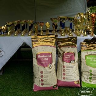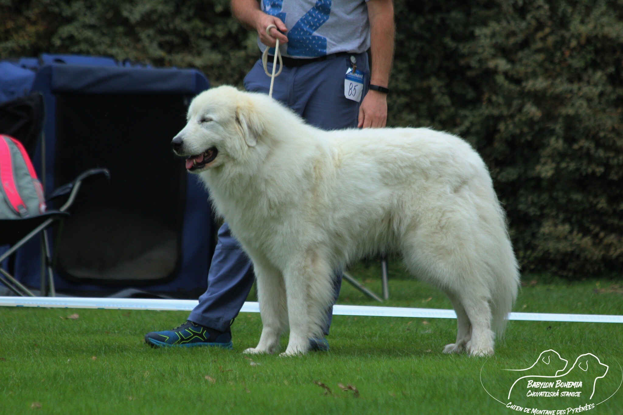 Z posudku - dobrá velikost, vývoj není ještě ukončený, mírný capri hřbet, výborná hlava, výborné proporce  lebka a čumák, perfektní oko, větší ucho, štíhlejší, vybočenější vpředu a vzadu tlapy, silné paspárky, výborné zaúhlední, užší vzadu, výborná arroundera, výborný rozsah v pohybu
